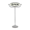 スペーシーなデザインのオープンサインスタンド。 堅牢な構造と周囲を映す金属の輝きに、思わず所有欲をくすぐられます。 全体のアクセントとなるボールノブや構造の要となるジョイントパーツの渋さもさることながら、スムースに回転するパネルと視認性の良いフォントなど、実用性の高さもポイント。 ショップの開店・閉店を告げるアイコンとしてだけでなく、美しい佇まいで来店するステータスを感じさせます。