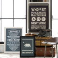ニューヨークの路線バス案内やエアポートの発着タイムテーブル、サーフポイントのCAUTIONサインにパリの名所タイポグラフィック。 ”旅のストーリー” を感じさせるキャンバス製ポスターを味わいのあるウッドフレームに閉じ込めたアートフレームです。