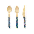 スプーン、フォーク、ナイフが各10本入ったフローラルデザインのウッドカトラリーセット。