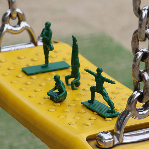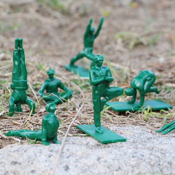 男性兵士が銃を持たずヨガをする姿は心の平和や非暴力が表現されています。