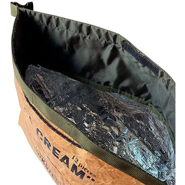 *アルミ蒸着素材を裏地に使用した簡易保冷機能・開閉しやすいように口まえにコードを付属