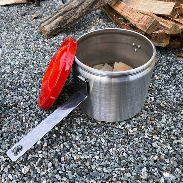 鮮やかな赤い蓋が印象的なアルミ製キャニスター。食材を中に入れて持ち運び、外でそのまま直火にて調理することが可能です。