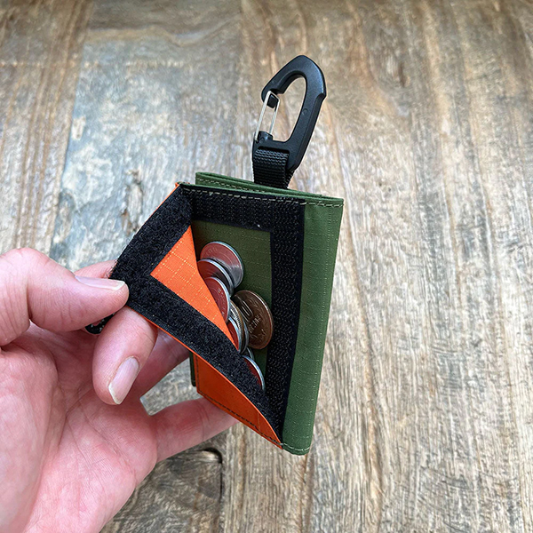 小銭入れ部分は面ファスナーで開閉。容量はコンパクトなため、お釣りの小銭程度の収納量です。