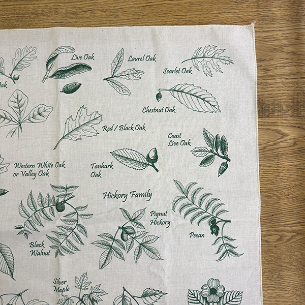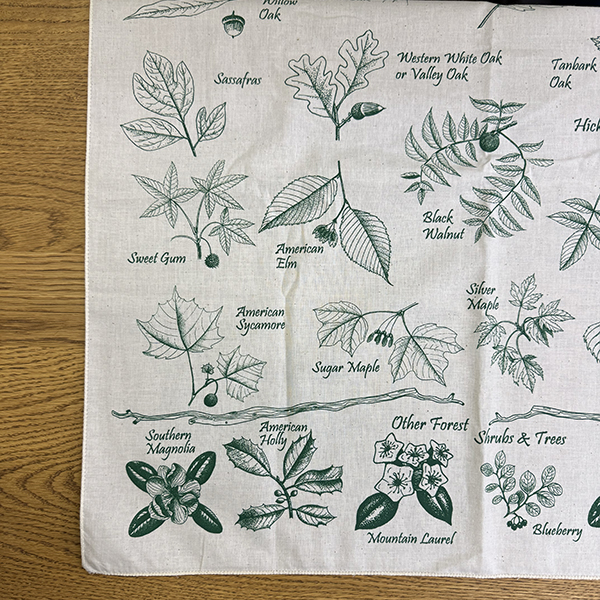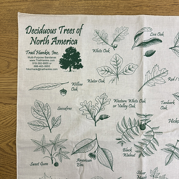 この楽しくて教育的なバンダナには、北米の最も有名な木や低木のいくつかのイラストが描かれています。