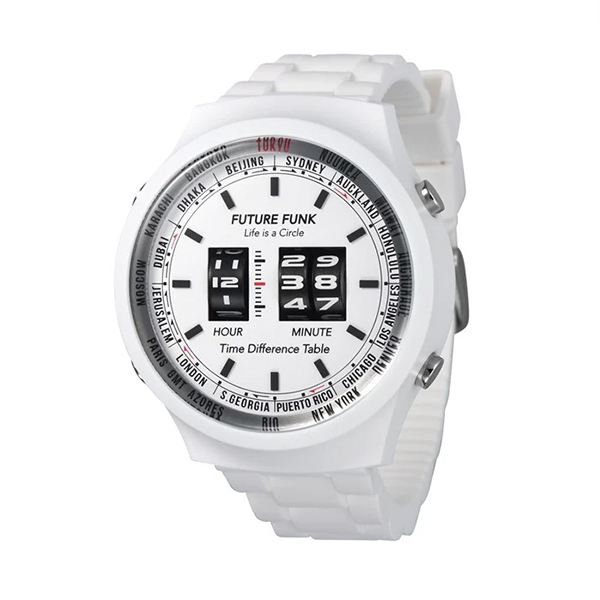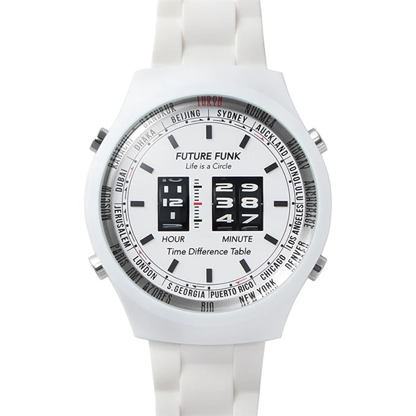 新しく開発されたFUTURE FUNKは、そのアナログデジタル復刻の夢を叶えた、ローラーを縦に回転させることによって時刻を表示することができる、クオーツ時計としては画期的なムーブメントを内蔵した腕時計です。 |